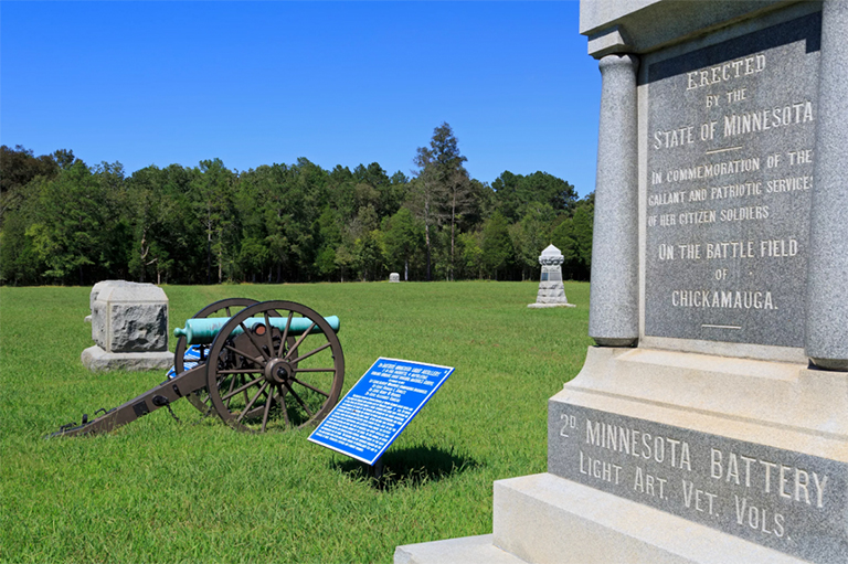位于佐治亞州與田納西州北部邊界的奧格里索普堡附近的奇卡莫加(Chickamauga)和查塔努加國(guó)家軍事公園(Chickamauga&Chattanooga National Military Park)向奇卡莫加(Chickamauga)市致敬,奇卡莫加市是南北戰(zhàn)爭(zhēng)期間脫離聯(lián)邦的重要地點(diǎn)。2500個(gè)小鎮(zhèn)位于田納西河的河岸,穿過(guò)阿巴拉契亞山脈,這是丘陵鄉(xiāng)村中的一個(gè)空間,允許四大鐵路匯合。
