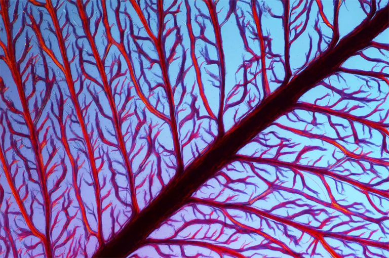 這是紅藻Plumaria elegans的細分支th的一部分的光學顯微照片。所謂的優雅外觀,在這里可以看到藻類絲狀分支中的單個細胞。紅藻常見于熱帶海洋地區。與其他藻類不同,這些真核細胞缺乏鞭毛和中心粒。紅藻生長在包括熱帶珊瑚礁在內的固體表面上,或附著在其他藻類上。它們的細胞壁由纖維素和許多不同類型的碳水化合物組成。這些藻類由單孢子(無鞭毛的壁狀球形細胞)無性繁殖,單孢子由水流攜帶直至萌發。紅藻也有性繁殖,并世代相傳。紅藻形成許多不同類型的海藻。