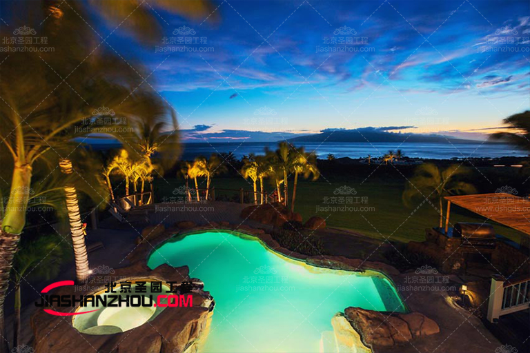 華麗的花園水泥塑石假山園林景觀區,四周被植物和灌木叢包圍,營造出自然而有條理的感覺。該區域通過較大的雙開門與主體結構有所隔離,從而提供了多的隱私保護。該區域的地板使用PVC木地板,以大程度地抵抗自然元素,而家具則采用灰色金屬制成,并使用防水織物作為坐墊。帶很多座位的中央火坑,使它成為夜間娛樂的好地方。