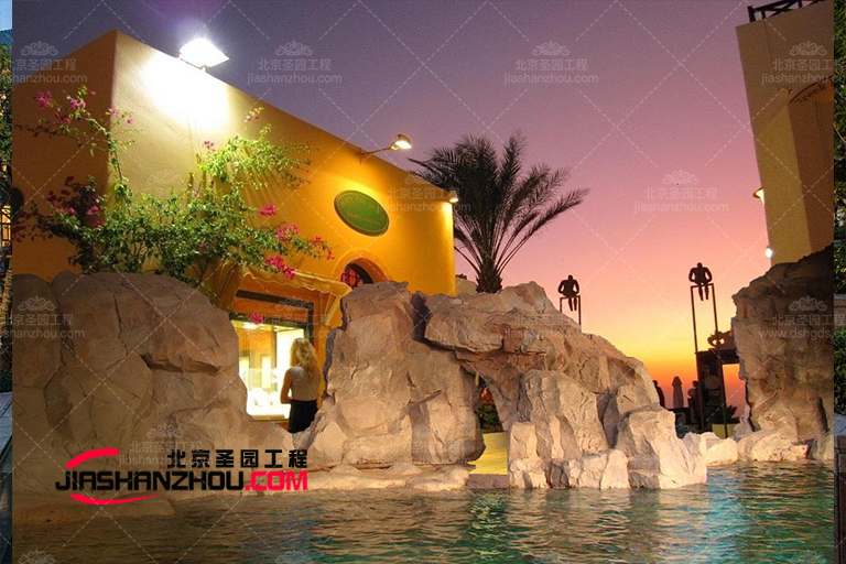 在仿真樹的一隅,一座由石板心堆砌的假山靜靜矗立,其上點綴著各式各樣的仿真樹,宛如巧的擺件般散落,使得原本沉寂的仿真樹煥發出勃勃生機。這整棵仿真樹坐落于主樓前的水池中央,不僅為主體建筑增添了別樣的裝飾,越加成為庭院中一道引人注目的f 景。